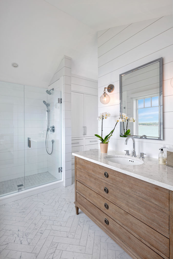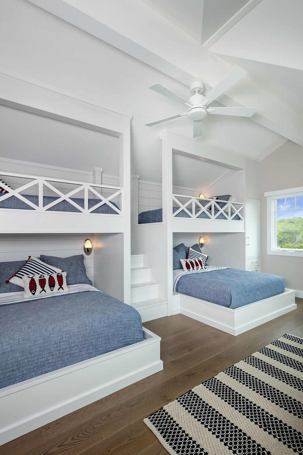 This custom coastal home includes a thoughtfully designed bunk room, sunlit living spaces, and tranquil bathrooms oriented toward the ocean. The project was recognized with a national Chrysalis Award for its cohesive, well-crafted design and construction.